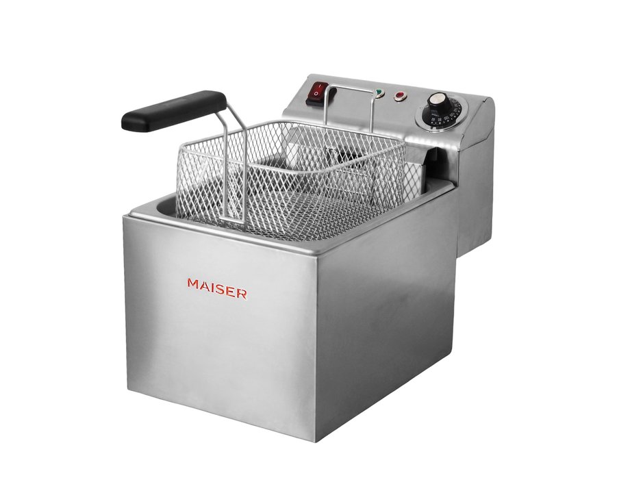 Freidora eléctrica Maiser 8 litros de aceite con sistema MAXI ECO y contactor 40A. Potencia MAXI: 4.5 kW | Potencia ECO (ahorro): ~2.2 kW — ahorro energético de hasta un 25%. Cuba simple de acero inoxidable, sin grifo. Medidas: 265 x 325 x 225 mm. Pide presupuesto sin compromiso.