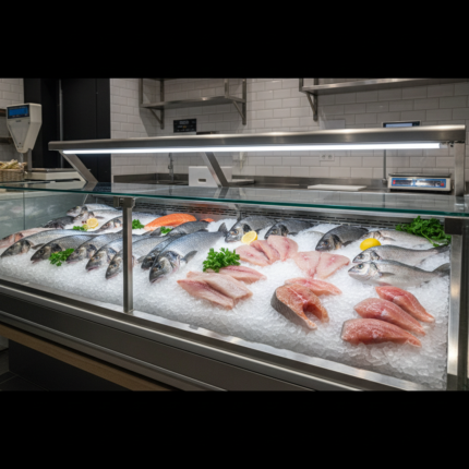 - Vitrinas para pescadería — Con bandejas de hielo o refrigeración especial para marisco y pescado fresco.