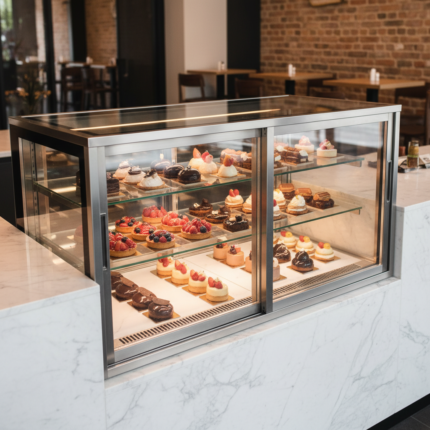 - Vitrinas de pastelería y panadería — Temperatura entre 2 y 8 °C, iluminación LED, cristal curvo para máxima visibilidad del producto.