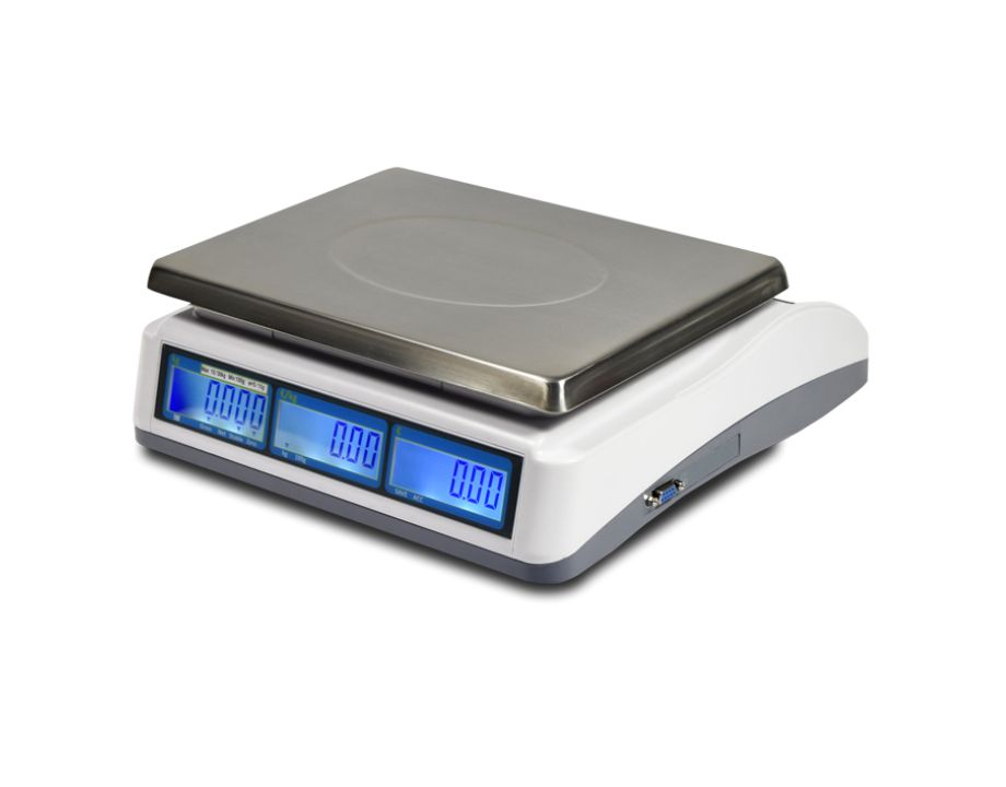 Este modelo ofrece dos versiones: TW (sin columna) y VW (con columna) para adaptarse al layout del espacio. El plato de acero inoxidable mide 300 × 230 mm y la carcasa es de ABS robusto, pensada para resistir el uso diario. Los valores de capacidad y sensibilidad incluyen rangos como 3/6 kg con división 1/2 g, 6/15 kg con 2/5 g, 15/30 kg con 5/10 g, según versión. Para lectura, cuenta con 6 pantallas LCD retroiluminadas (3 para vendedor, 3 para cliente), dígitos de 20 mm de altura. En versiones de 15/30 kg, lleva salida RS232 de serie para conectar con TPV, PC o impresoras. Además, soporta múltiples protocolos estándares de comunicación (TPV0, Uniwill, Toledo, Cas, TISA, etc.). La balanza está homologada conforme al modelo CE con verificación de serie, lo cual la habilita para transacciones comerciales reguladas por peso.