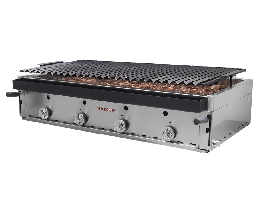 La barbacoa de lava volcánica Maiser B-120 es un equipo de gas profesional de 120 cm de ancho con 25,2 kW de potencia. La parrilla en acero pavonado trabaja sobre 12 kg de lava volcánica que irradia calor estable y homogéneo durante todo el servicio. Gas propano-butano con inyectores de gas natural incluidos.