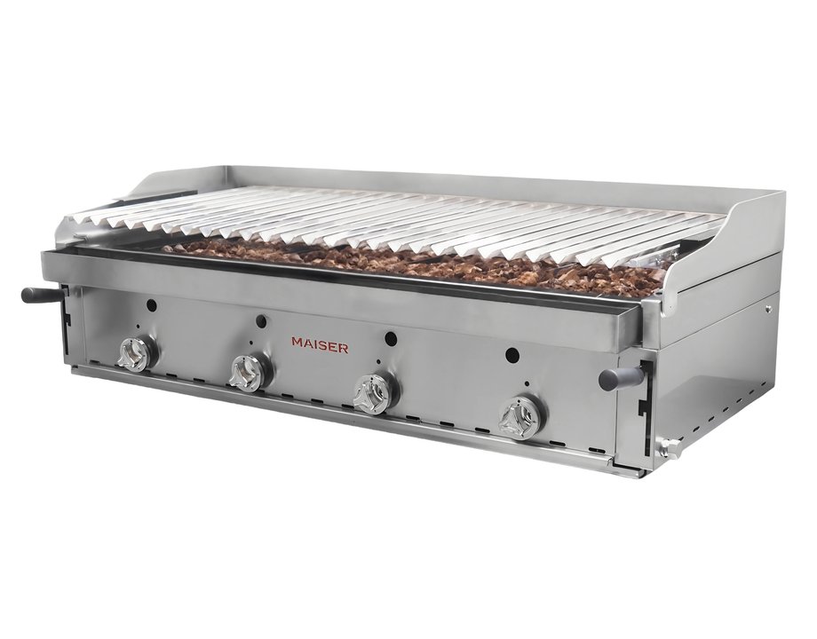 La barbacoa de lava volcánica Maiser B-120X+M es un equipo de gas profesional de 120 cm de ancho con 25,2 kW de potencia. La parrilla en acero inoxidable AISI 304 electropulido trabaja sobre 12 kg de lava volcánica que irradia calor estable y homogéneo durante todo el servicio. Gas propano-butano con inyectores de gas natural incluidos.