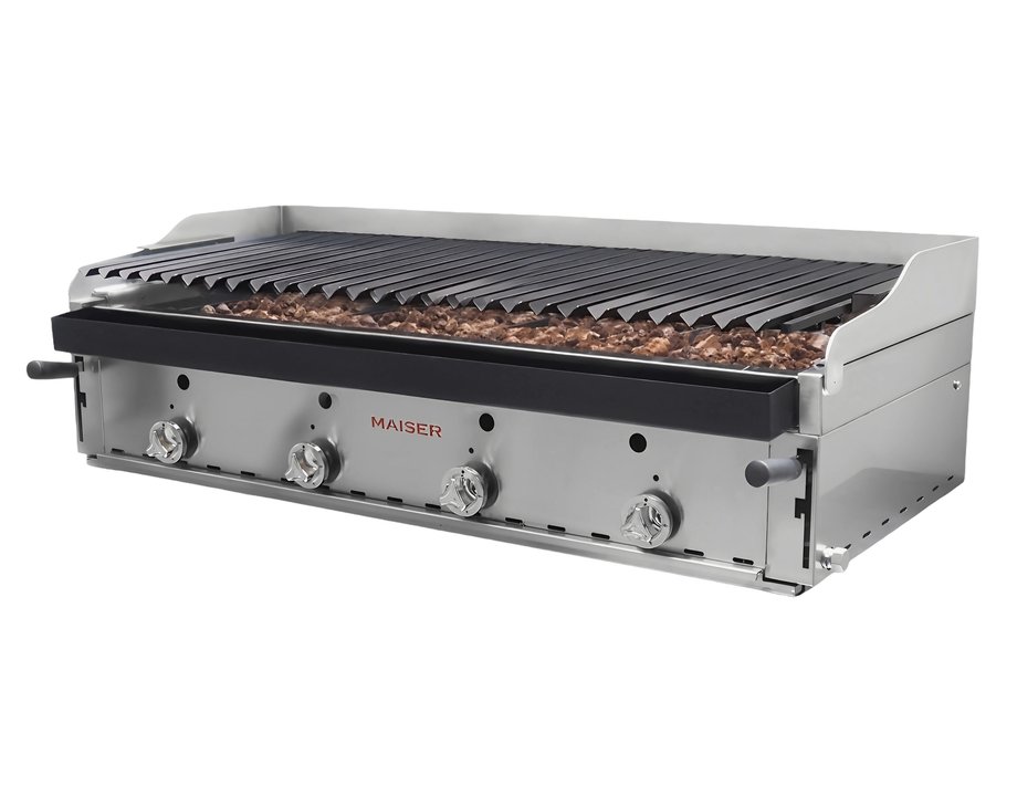 La barbacoa de lava volcánica Maiser B-120+M es un equipo de gas profesional de 120 cm de ancho con 25,2 kW de potencia. La parrilla en acero pavonado trabaja sobre 12 kg de lava volcánica que irradia calor estable y homogéneo durante todo el servicio. Gas propano-butano con inyectores de gas natural incluidos.