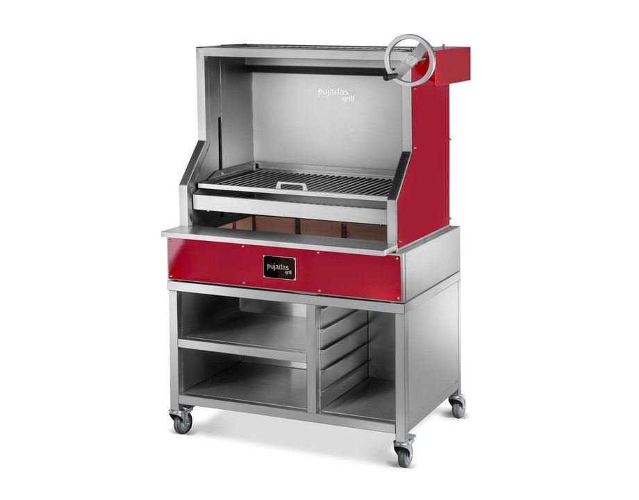 Brasa abierta profesional Pujadas Grill Open Grill sin base refractaria, color rojo. Estructura completa con mesa, parrilla de varillas y elevación regulable hasta 400 mm. Para instalaciones con base existente. 98 x 68,3 cm. Acero inoxidable, fabricada en España. Pide presupuesto.