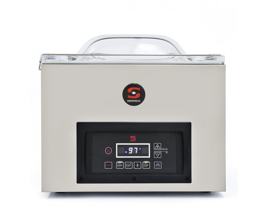 La Sammic SE-416 combina la cuba grande de la serie 400 (430 x 415 mm) y barra doble de 420 mm con una bomba Busch de 16 m³/h: ciclos rápidos en formato grande. Control por sensor de precisión, presión de vacío máxima de 2 mbar, acero inoxidable integral y homologación NSF.