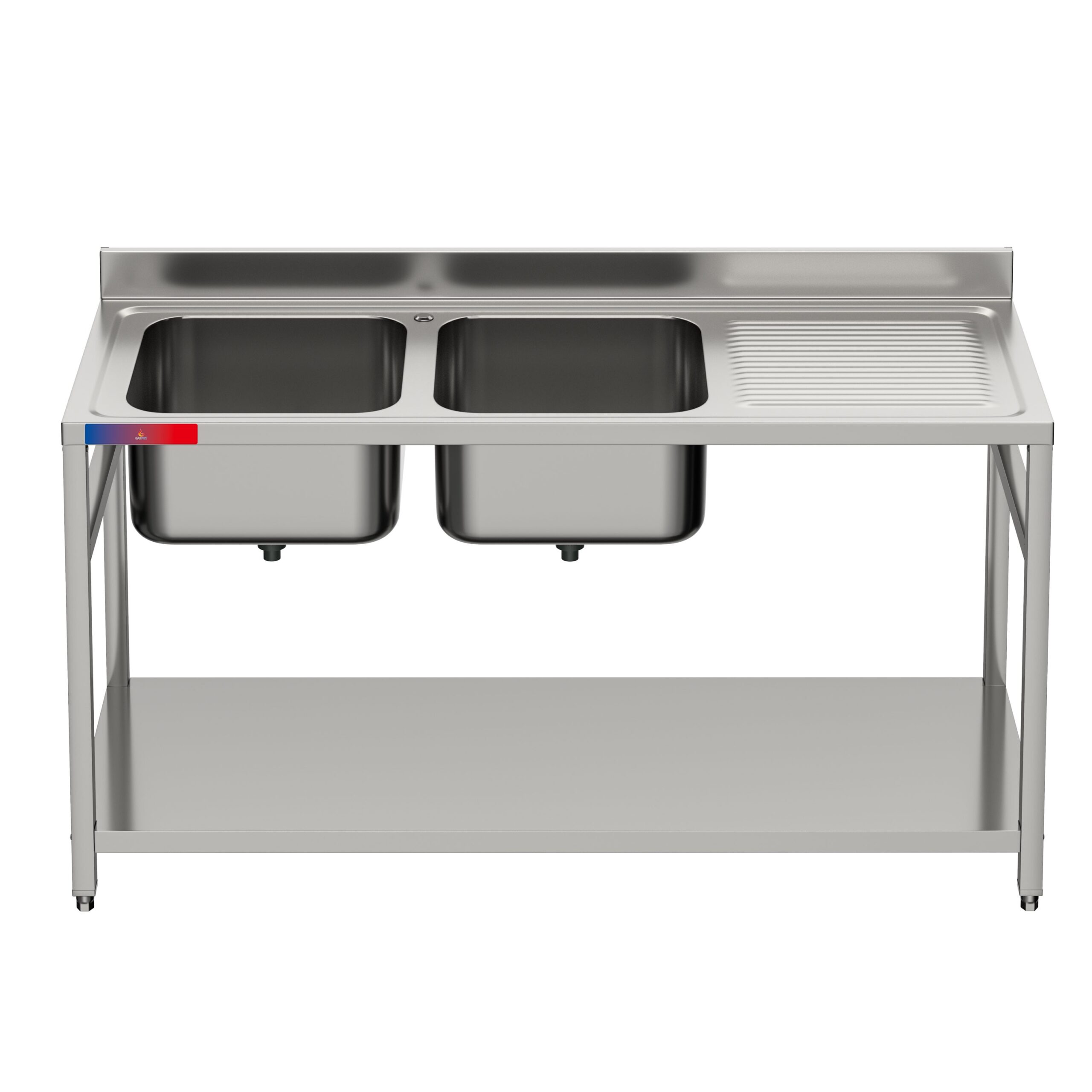 En cocinas de alto volumen, un fregadero pequeño es un cuello de botella constante. El personal se acumula, los utensilios mojados invaden la encimera y el ritmo de producción cae. Con 1.600 mm de longitud total tienes espacio suficiente para lavar, escurrir y continuar trabajando sin interrupciones. El peto posterior de 100 mm protege la pared de salpicaduras y facilita la limpieza al final del servicio.