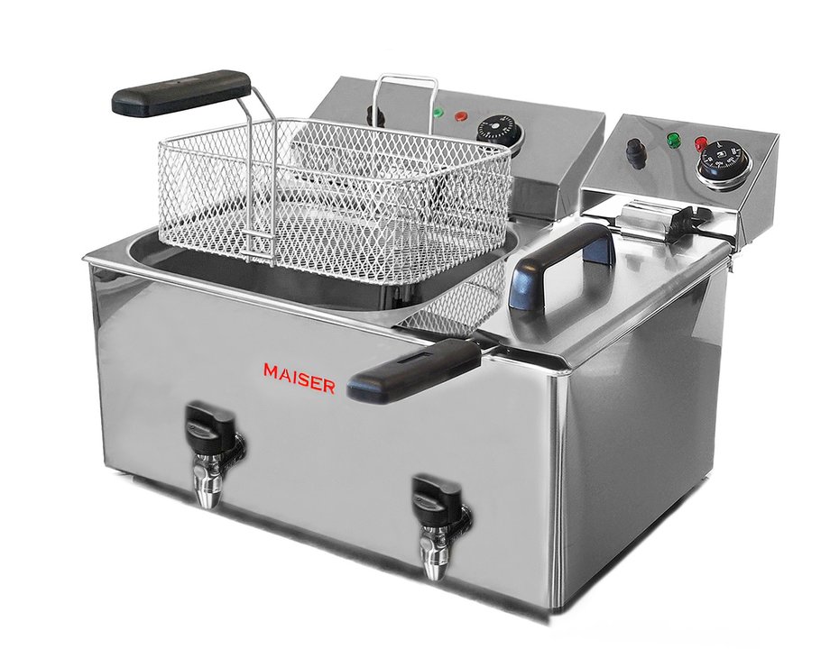 La freidora eléctrica Maiser F12/10+6/4G ofrece doble cuba independiente con 10+4 litros de aceite en total, ideal para freír dos productos distintos de forma simultánea sin mezclar sabores. Fabricada en acero inoxidable y diseñada para el uso continuo en cocinas profesionales.