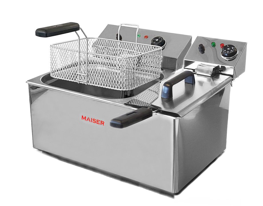 La freidora eléctrica Maiser F12/10+6/4 ofrece doble cuba independiente con 10+4 litros de aceite en total, ideal para freír dos productos distintos de forma simultánea sin mezclar sabores. Fabricada en acero inoxidable y diseñada para el uso continuo en cocinas profesionales.