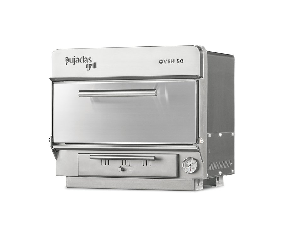 Modelo: Oven 50 Inoxidable. Capacidad: 40-50 comensales. Dimensiones: 69 x 57 x 62 cm. Peso: 169 kg. Combustible: carbón vegetal. Aislamiento: cerámico hasta 1.200 °C. Material: acero inoxidable. Color: inoxidable. Incluye: regulador de tiro superior (P851001) y cortafuegos externo (P851002). Mesa/soporte: se vende por separado. Marca: Pujadas Grill (Vollrath). Fabricado en España.