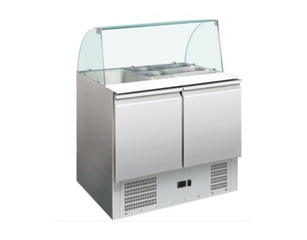 Mesa de preparación refrigerada con cristal curvo 3 puertas y 400 litros de capacidad. El frontal de cristal curvo permite ver el contenido de un vistazo sin abrir. Incluye tabla de corte de 200 mm y dos parrillas GN1/1. Temperatura +2°C a +8°C. Clase energética C.