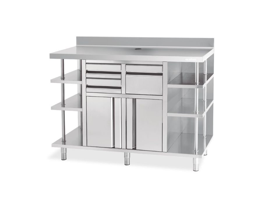 Mueble cafetero profesional en acero inoxidable AISI 304 de 1000x600x1050 mm, con compartimento doble, encimera y peto sanitario de 100 mm, cajones con tirador integrado y patas regulables hasta 200 mm. Organizacion superior en el metro justo. Pide presupuesto.