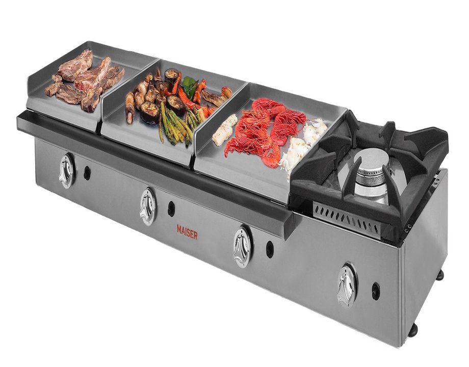 Plancha a gas triple placa de 40 acero rectificado 8 mm con fogón Maiser — superficie de acero rectificado de 8 mm, con fogón integrado, alimentación a gas. Plancha profesional de fabricación española.
