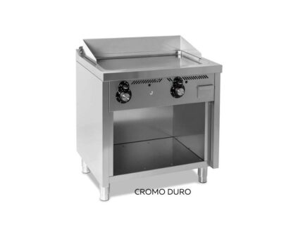 Plancha de gas a cromo duro 80 cm, placa 10 mm (50 micras), 2 válvulas termostáticas ECOGAS. 8,9 kW con 3 quemadores italianos. Control de temperatura por zonas para cocinar géneros distintos a la vez. Inyectores gas natural incluidos. Pide presupuesto.