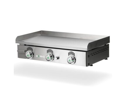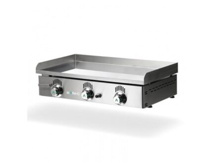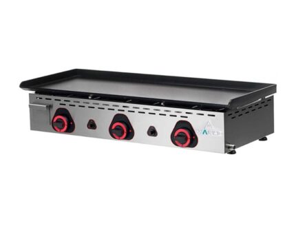 Dimensiones: 810 x 472 x 229 mm | Potencia: 8,9 kW | Alimentación: Gas propano-butano (GN incluido) | Material: Cromo duro 10 mm (50 micras) | Quemadores: 3 | Grifos: 2 termostáticos