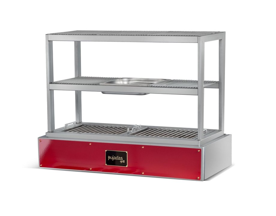 Robata de sobremesa Pujadas Grill con base refractaria, cámara térmica hasta 1200 °C, 5 rejillas móviles y cubeta GN 2/3 extraíble. Formato compacto para instalar sobre mesa de acero. Peso neto 140 kg. Instalación sobre superficie de acero inoxidable recomendada. Pide presupuesto.