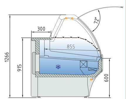 Además, incluye una reserva refrigerada de 440 × 270 mm, perfecta para mantener stock adicional sin perder accesibilidad. Su aislamiento de poliuretano de 40 kg/m³ garantiza un consumo eficiente y una temperatura estable, incluso en jornadas intensas.